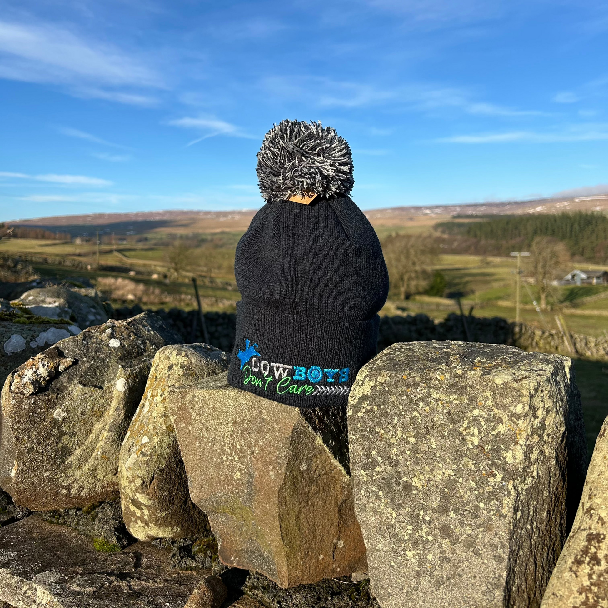 Navy blue pom pom hat finished with our signature embroidery - team this with your warmest jacket for mornings on the quad and afternoon dog walks.