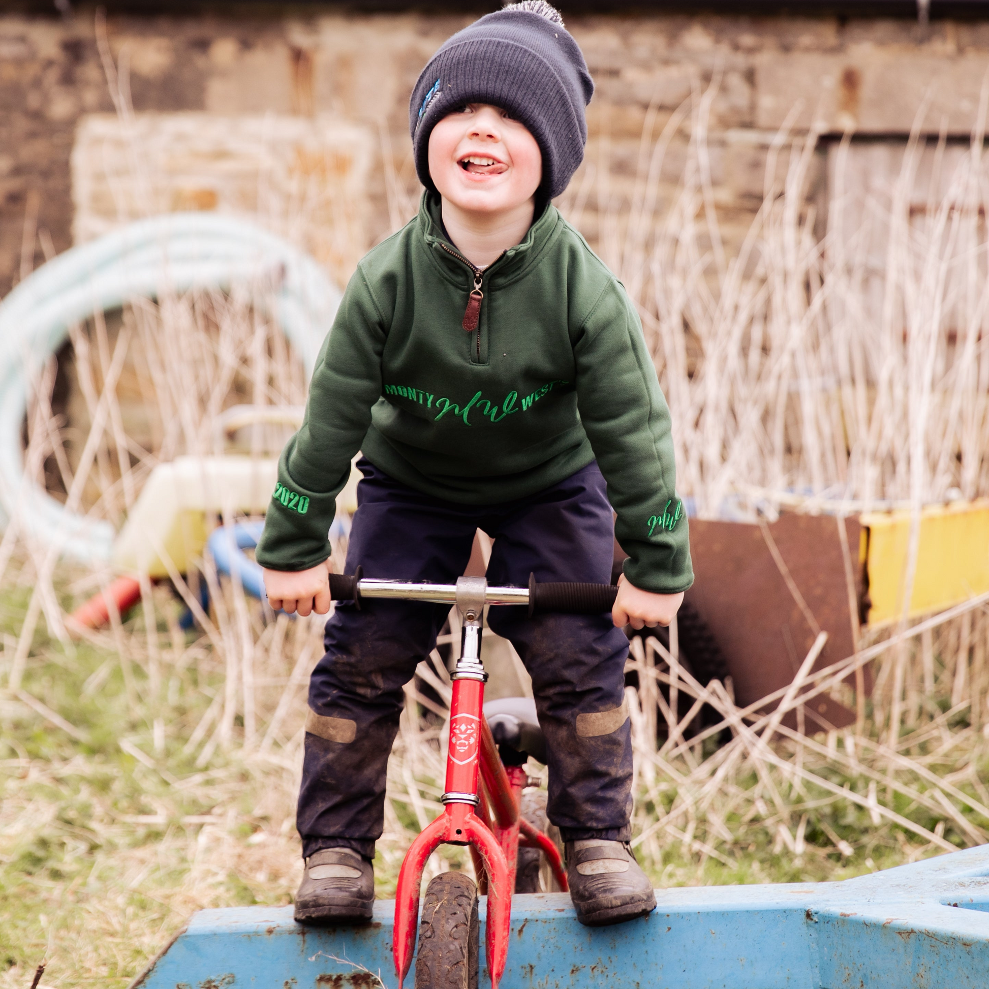 The Baldersdale, named after the beautiful dale of Monty West’s HQ, is the first piece of our unisex collection. Cosy and comfortable, this quarter zip sweatshirt is perfect for mini farmers who are constantly on the go.